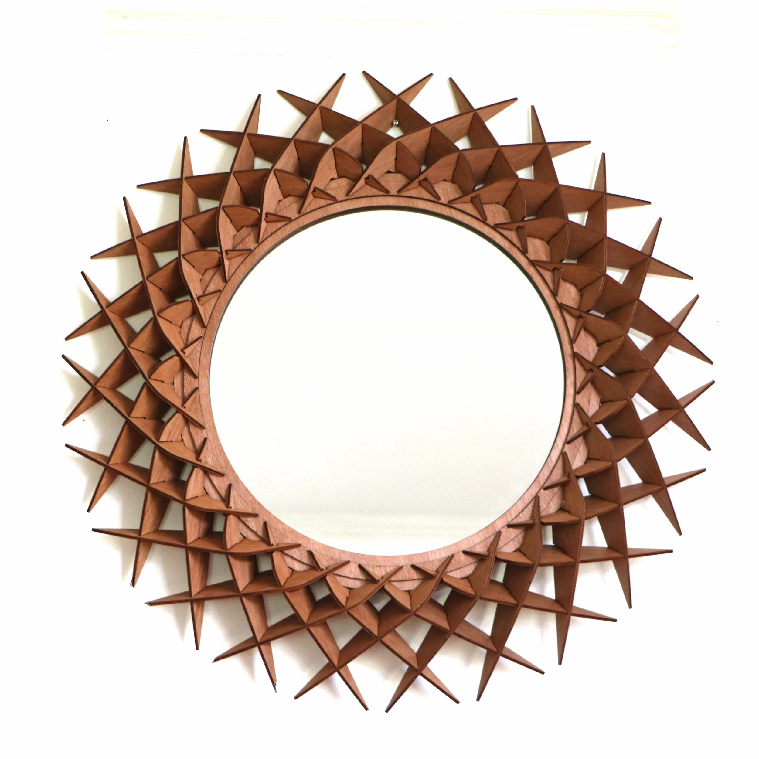 A luxurious round wall hanging mirror made from walnut staves .